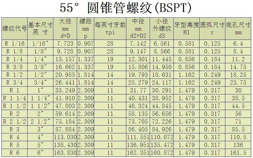 另外還有:ISO—公制螺紋標準60度;UN—統(tǒng)一螺紋標準60度;API—美國石油管螺紋標準60度;W—英國惠氏螺紋標準55度。