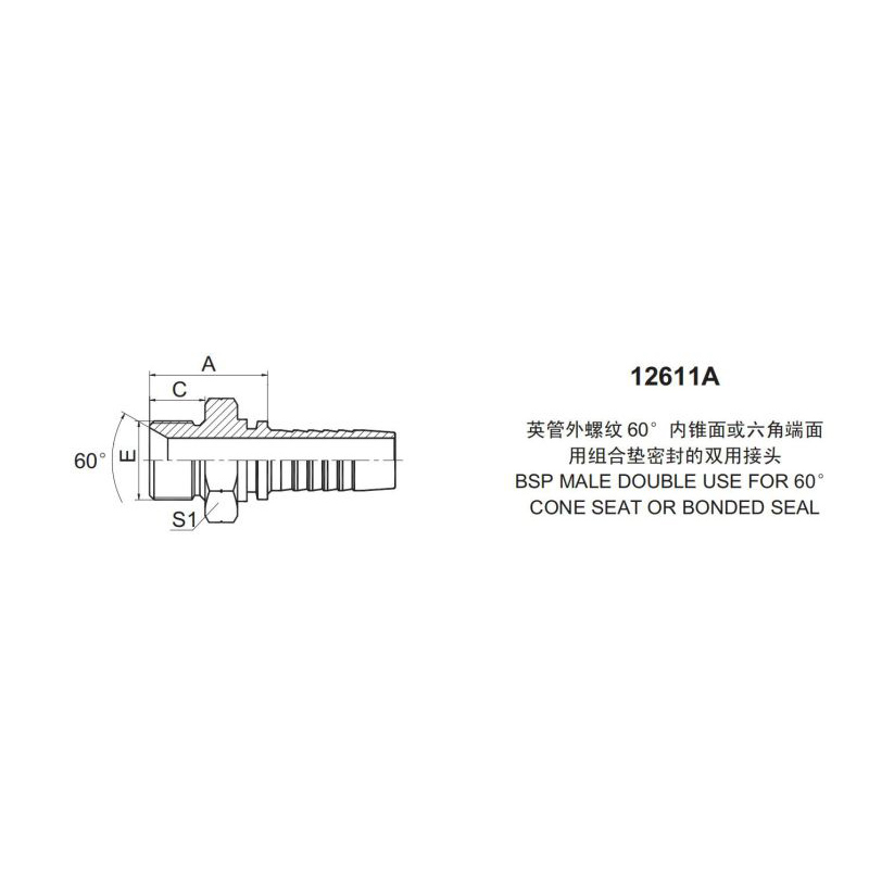永華標準扣壓式接頭 12611A 英管外螺紋 60內錐面或六角端面 用組合墊密封的雙用接頭BSP MALE DOUBLE USE FOR 60CONE SEAT