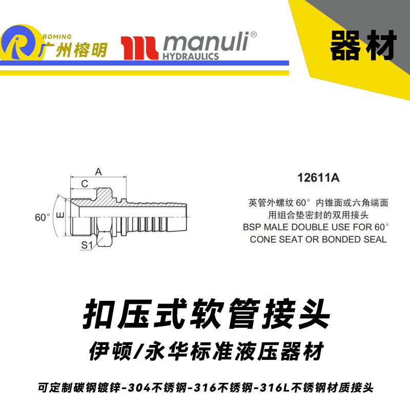 該接頭常用材質有碳鋼彩、碳鋼鍍白鋅、304不銹鋼、316不銹鋼、316L不銹鋼,用戶可根據需求聯系我們進行采購,此外,我們還可進行加工定制各種非標接頭以及給膠管-油管-軟管-水管進行扣壓接頭加工制作成總成。